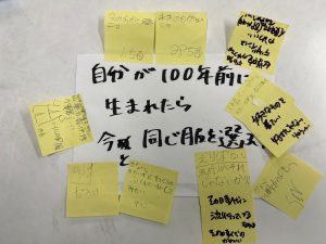 そしたら、自分が100年前に生まれたら、令和の今と同じ服を選ぶのか?という問いには、「流行がそれじゃないから、選ばない。」「その時代に流行っているものは、その時代の可愛いだから。」「好きなものを着たいなーその時代のは好みじゃないから。」と、過去と現代とは異なるオシャレがあることに気づいている部分もあり、過去のオシャレを理解するのは難しい部分も。