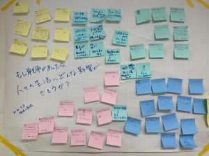 もし戦争があったら、生活にどんな影響が出そうかということを衣食住+その他に分けて考えていきました。衣服に関しては、みんなの予想はペラペラでボロボロの服ばかり着ているイメージ。その他には「推し活ができない」「ラグビーができなくなる」「親が戦争に行って泣く」などなど。これは切実な問題ですね・・・。