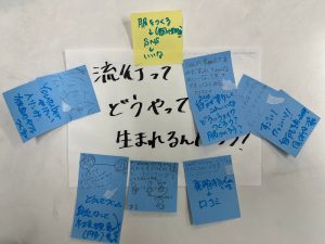 流行についてイメージすることを聞いてみると、「流行って例えば、前APT流行ってたけど、今あんまり聴かないみたいな?」「流行って廃れる」「ゴディバなんて昔なかったけど、今みんな流行ってるよな」流行はどこからか始まって、いつか廃れるという流れがキッズの中でも、実感としてあるようです。