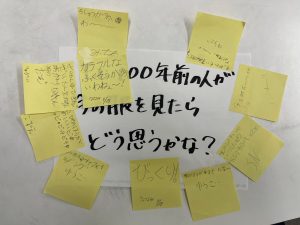 テーマ外出後のふりかえりの中では、それぞれ達人に聞いたことや博物館の展示解説で読んだことをシェアしたことで、全員の学びが深まりました。予想とだいぶ違ったところ、予想もしていなかった歴史の事実がありました。