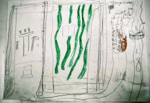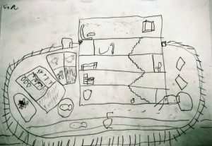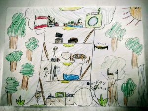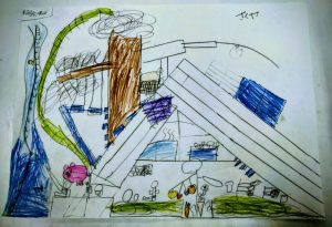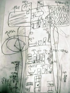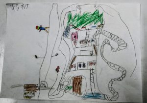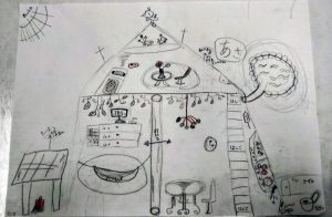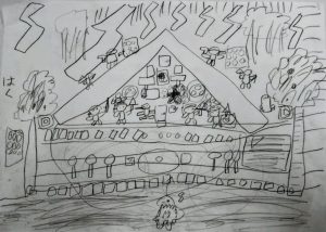 キッズからチラホラ「もう早く描きたい、作りたいよ」の声が出てきたところで、どのくらい概念としての建造物の先行知識を持っているのだろう? 「自然のような家」を描いてみることにする。