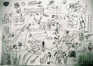 今話題の「熊」を撃つ麻酔銃を備えた家があったり、ともだちの「トイレ」の説明に、「トイレを忘れていた~」とあわててトイレを描き加える姿もありました。