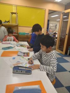 放課後になっても「自然のような家」の色塗りに夢中です。